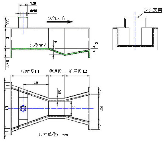 巴歇尔槽是明渠流量计用于污水排放量实时香蕉一区二区在线观看的流量测量辅助装置,其设计的尺寸大小和安装方式均直接影响到流量测量的准确度。巴歇尔槽的材质一般为8mm 厚的玻璃纤维不饱和聚酯复合材料(玻璃钢)。也可以是不锈钢金属材质,要求一定要防腐蚀,不能与污水发生任何反应且自身不能发生锈蚀现象。根据污水的流量,当流量越大时,相应增加壁厚,本项目采用8mm玻璃钢货2mm不锈钢材质制作巴歇尔槽。
